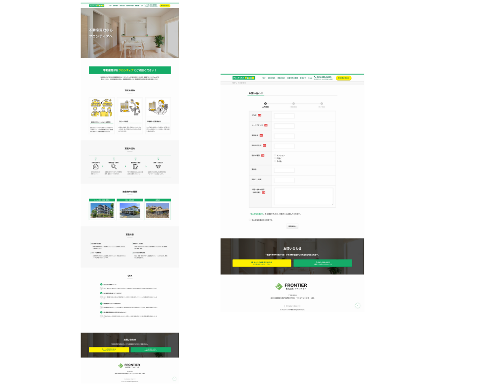 株式会社フロンティア様の不動産事業サイトを新規制作いたしました。 不動産売却・買取サービスを提供する企業として、「信頼感」や「安心感」を重視したデザインを採用し、ユーザーがスムーズに情報へアクセスできる構成を意識しました。